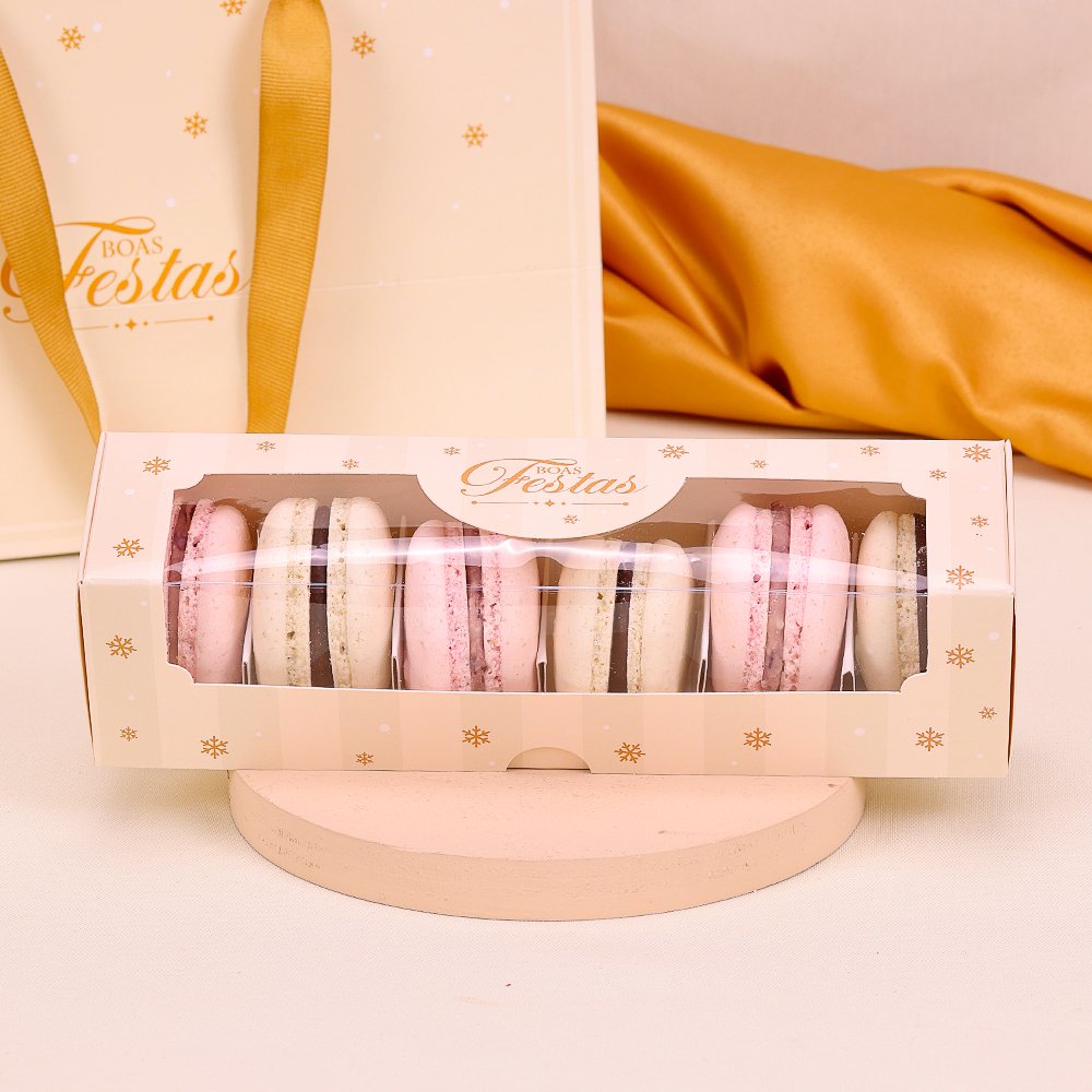 - Visor transparente que valoriza os macarons, destacando cores e detalhes.