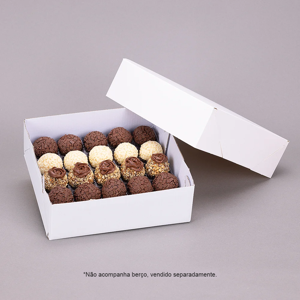 Com capacidade para 25 doces, essa caixa é ideal para confeiteiros que atuam com kits personalizados, lembranças e vendas sob encomenda. Seu formato retangular acomoda os doces com organização, agregando valor ao produto final com uma apresentação profissional.