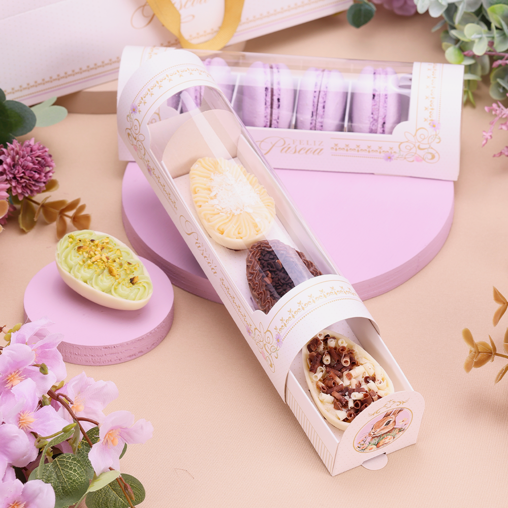 Esta embalagem foi desenvolvida para acomodar 3 mini ovos ou Macarons com charme e delicadeza, proporcionando uma apresentação sofisticada e organizada. Seu design com visor transparente valoriza o conteúdo, permitindo que as cores e texturas dos doces se destaquem.