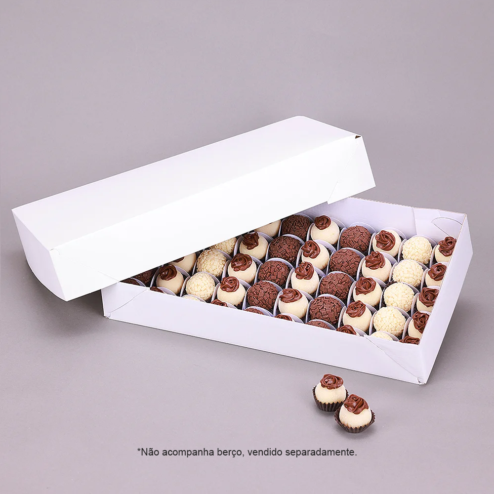 Com capacidade para 50 doces, essa caixa é ideal para confeiteiros que atuam com festas, kits personalizados e produção diária. A estrutura sem berço permite maior flexibilidade na disposição dos doces e salgados, facilitando o uso para variados formatos e combinações.