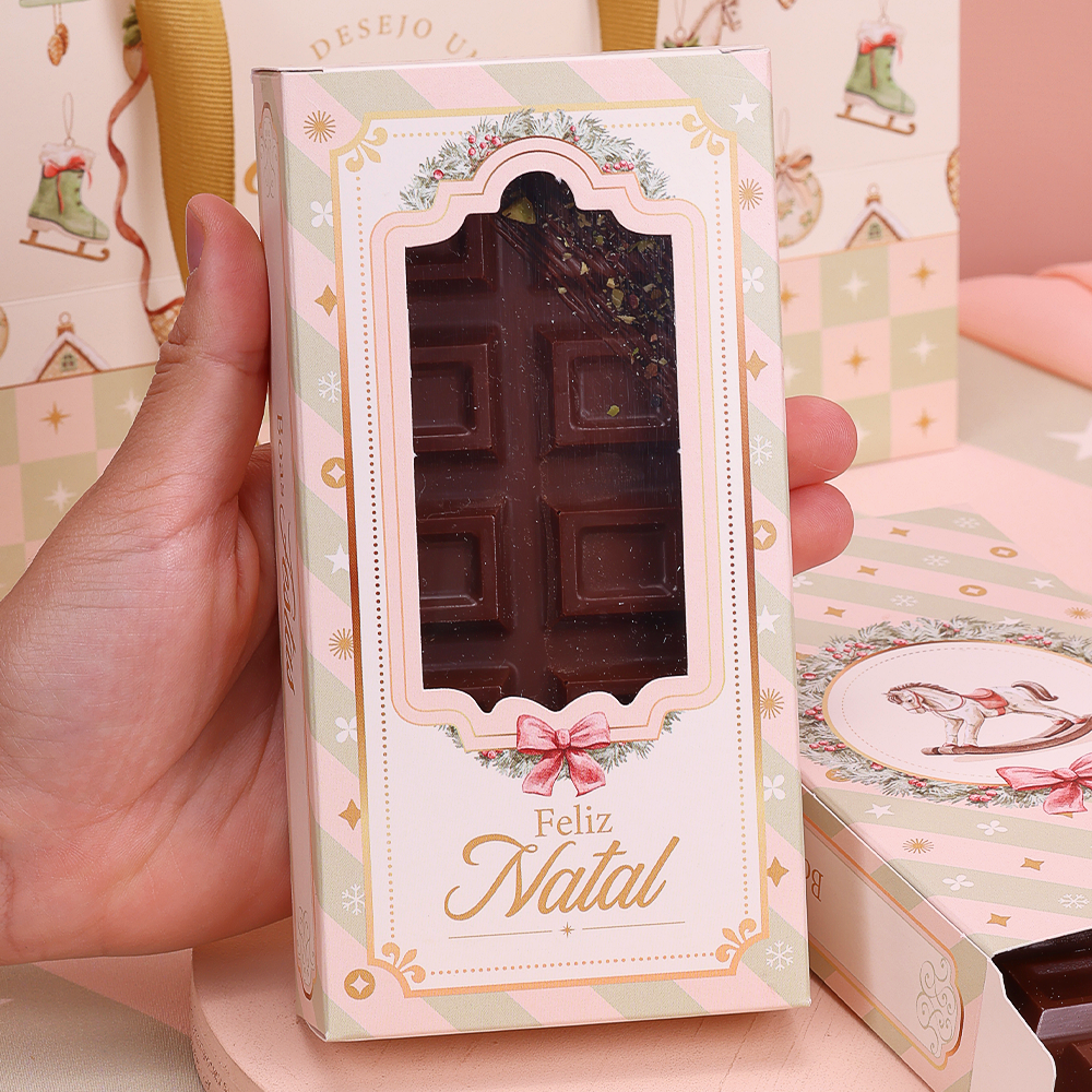 Laterais: As laterais da caixinha trazem a frase “Boas Festas” acompanhada de arabescos em dourado.