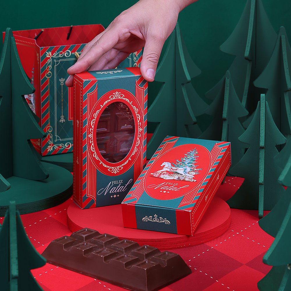 Frente: Fundo vermelho centralizado com moldura oval ornamentada em branco. Visor em formato oval que revela o chocolate interno. Abaixo, inscrição “Feliz Natal” em branco.