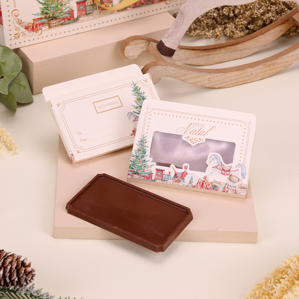 Frente: tem um visor transparente que exibe o produto sem abrir a embalagem .A decoração inclui uma árvore de Natal, um trem de brinquedo, um cavalinho de balanço, presentes e a frase "Feliz Natal"