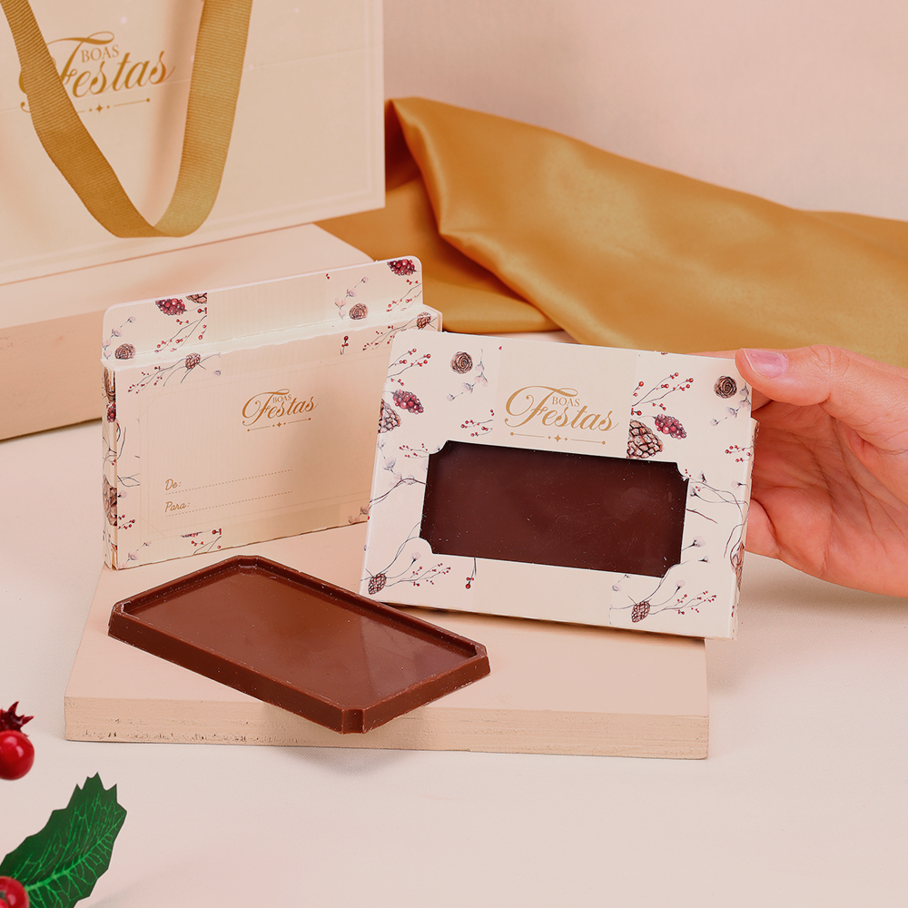 Frente: Fundo em tom bege suave com ramos delicados, pinhas e frutinhos vermelhos que remetem ao clima natalino. O centro traz a mensagem em dourado “Boas Festas”, acompanhada de visor transparente que valoriza a barra de chocolate.