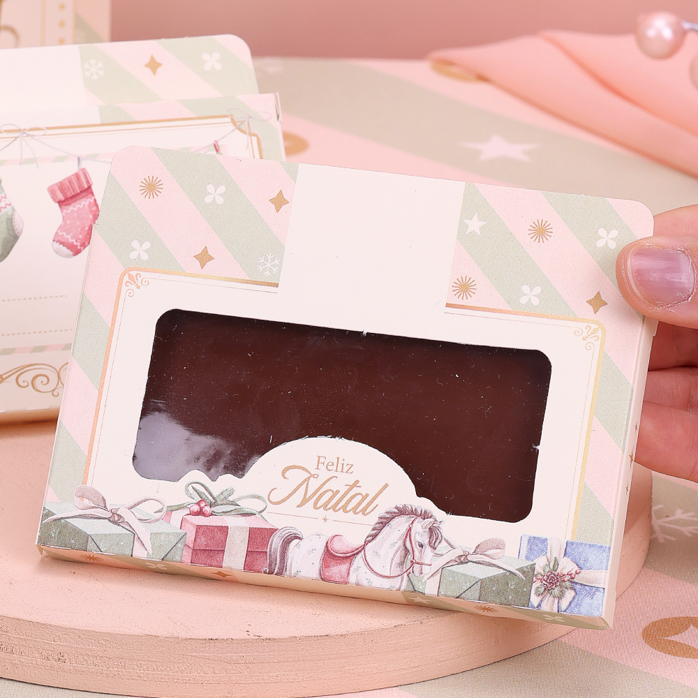 Frente: Possui visor transparente que valoriza o produto, acompanhado de ilustrações de presentes e um cavalinho de balanço, além da mensagem “Feliz Natal” em destaque.