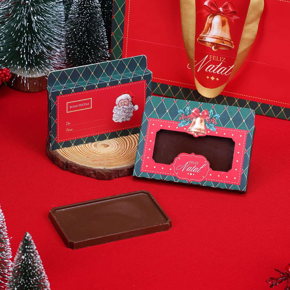 Frente: possui um visor transparente para que o conteúdo possa ser visto. A frase "Feliz Natal" está em destaque, acompanhada pela ilustração de um sino com laço vermelho
