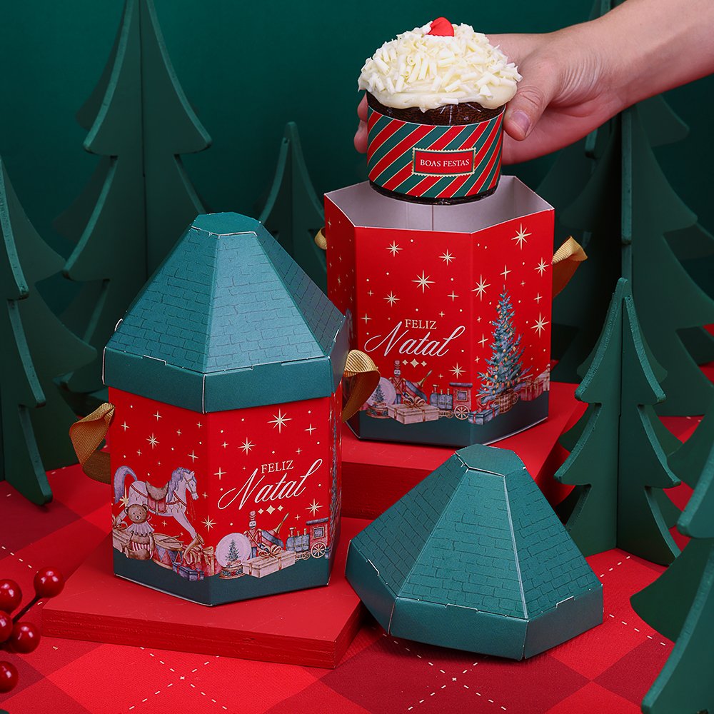Tampa: em formato de telhado texturizado, simulando tijolinhos, que remete ao aconchego natalino e dá um toque lúdico ao design.