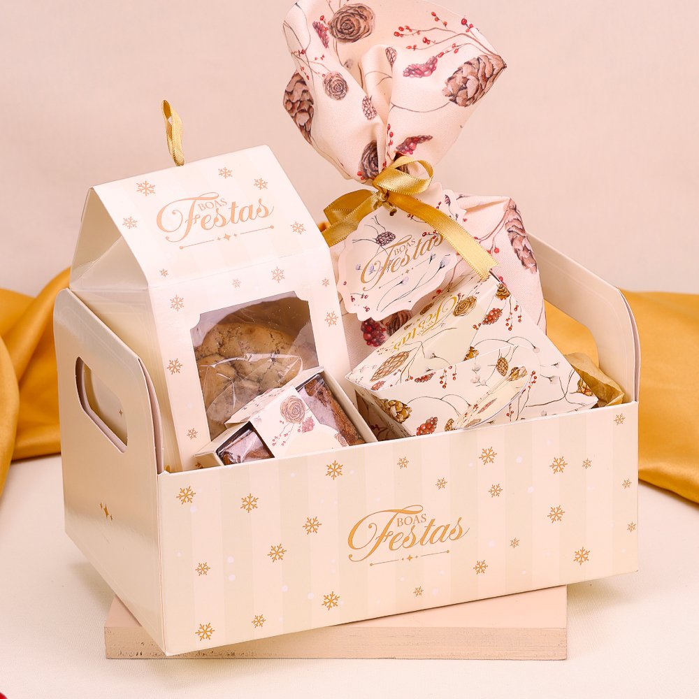 Frente: Ela é decorada com listras verticais e um padrão de flocos de neve dourados. A frase "Boas Festas" está escrita na parte frontal em letras douradas.