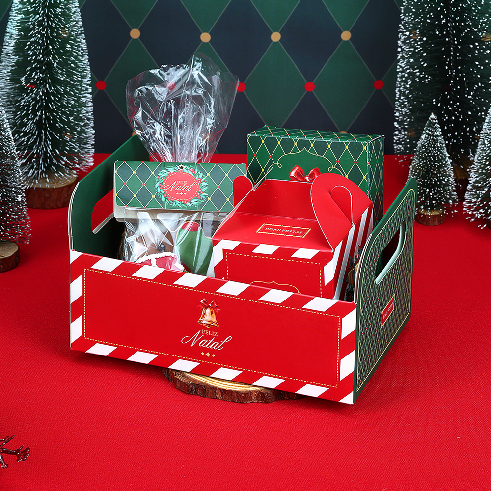Lateral: A lateral é verde e tem um padrão de losangos e um pequeno círculo vermelho com a frase "Boas Festas".