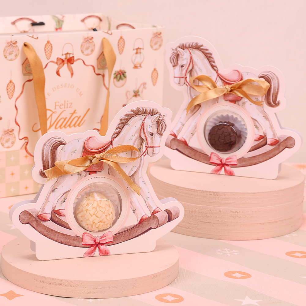 Ilustração delicada do cavalinho de balanço natalino, em tons suaves e com detalhes florais. Na base do cavalinho, há um laço rosa pintado