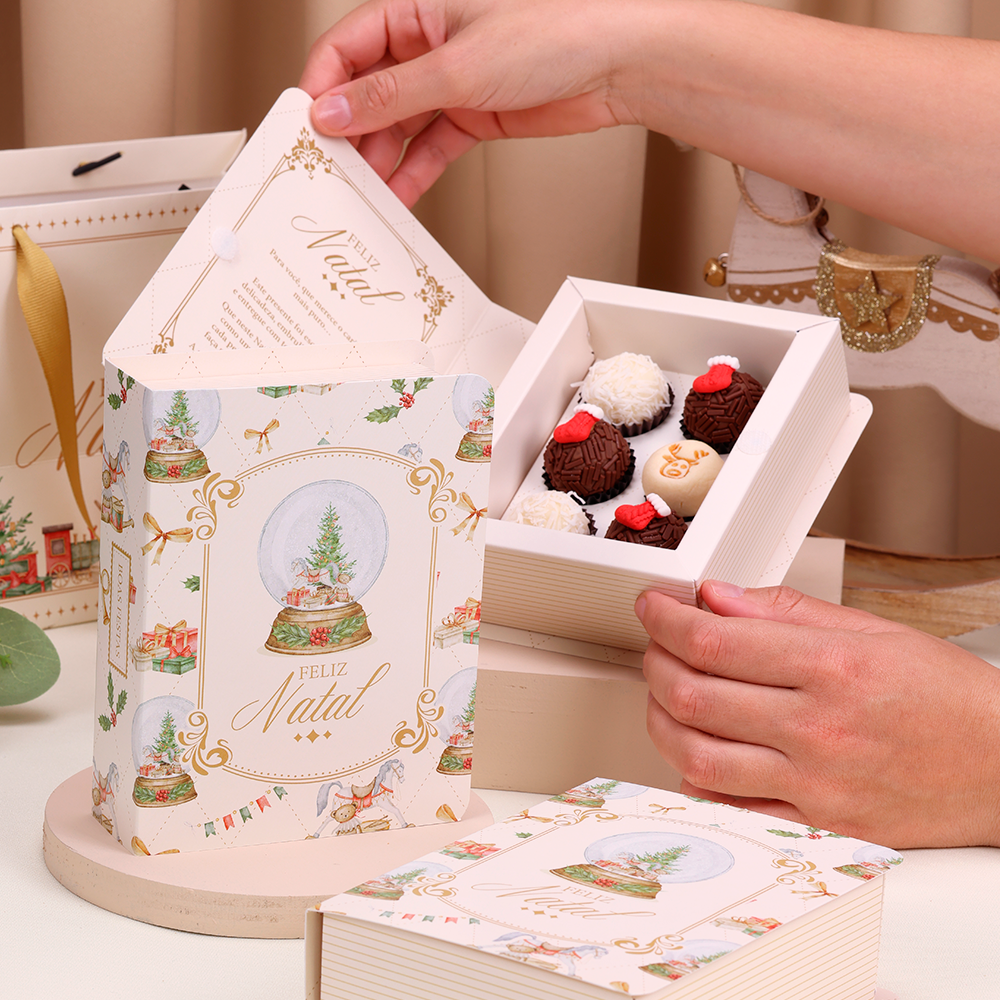 Frente: Há uma moldura central emoldurando uma ilustração de uma árvore de Natal decorada, cercada por brinquedos, incluindo um cavalinho de balanço e presentes. A base da moldura tem uma borda com pinhas e laços , e a frase "Feliz Natal" está escrita na aba superior da caixa.