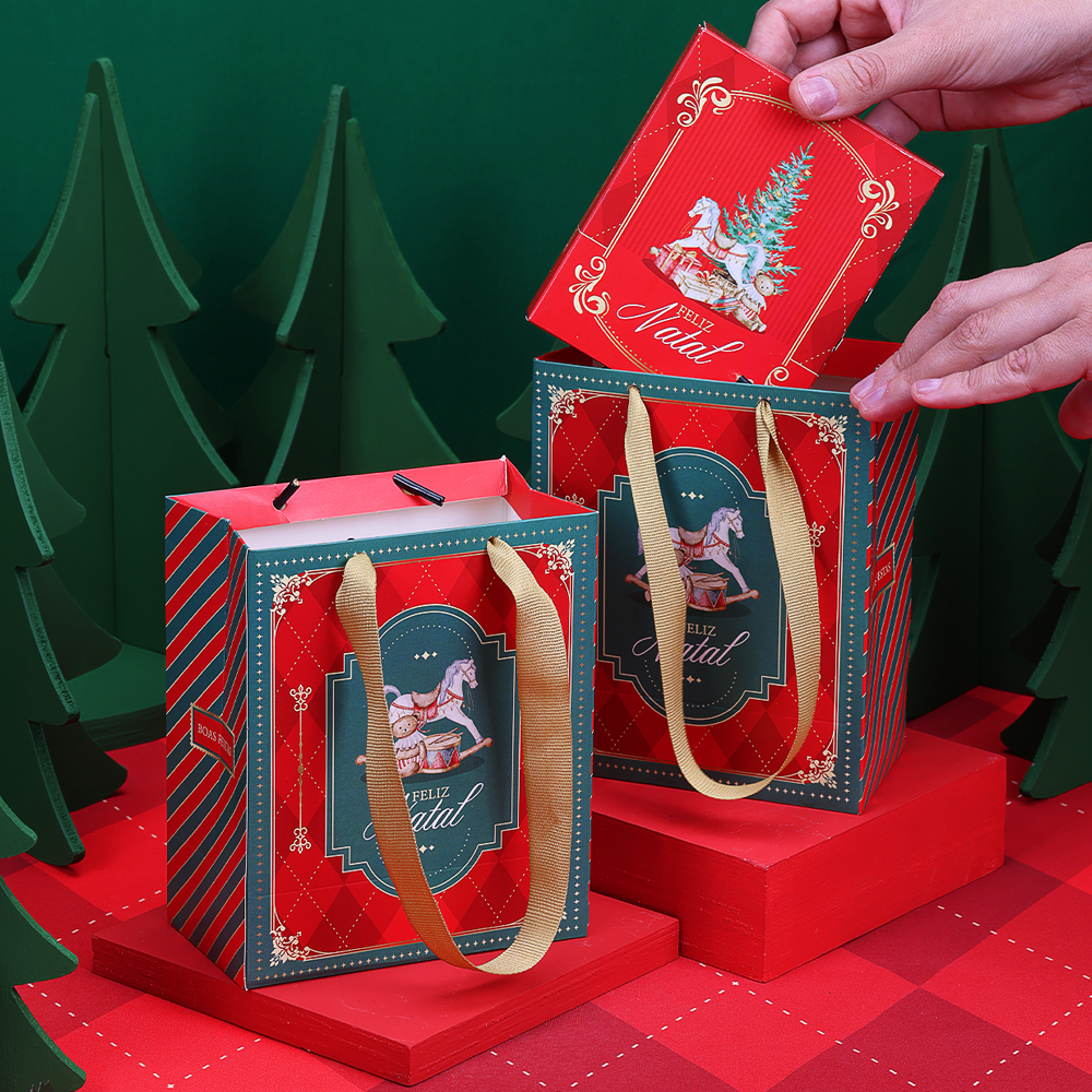 Frente: A frente da sacola é vermelha e apresenta um painel central com uma moldura decorada. No centro desse painel, há a ilustração de um cavalo de balanço e a frase "Feliz Natal".