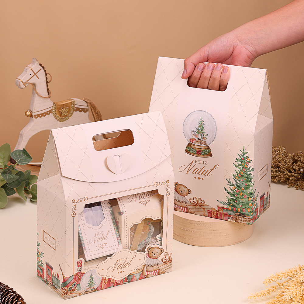 Verso: Conta com a frase "Feliz Natal", uma bola de neve com uma árvore dentro, e a mesma estampa de árvores e presentes.