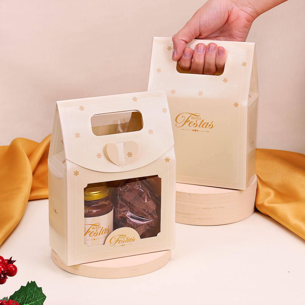 Ideal para montar kits com produtos pequenos. Acomoda perfeitamente 2 Vidros de 240ml, Caixa para barra 150g, 1 Cartão para biscoitos, Solapas.