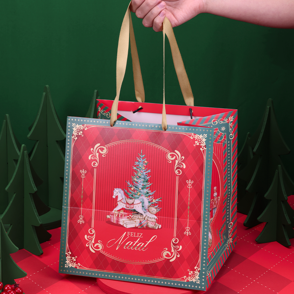 Frente: é predominantemente vermelha, com um padrão quadriculado e a frase "Feliz Natal". A estampa central inclui uma árvore de Natal, um cavalo de balanço e presentes.