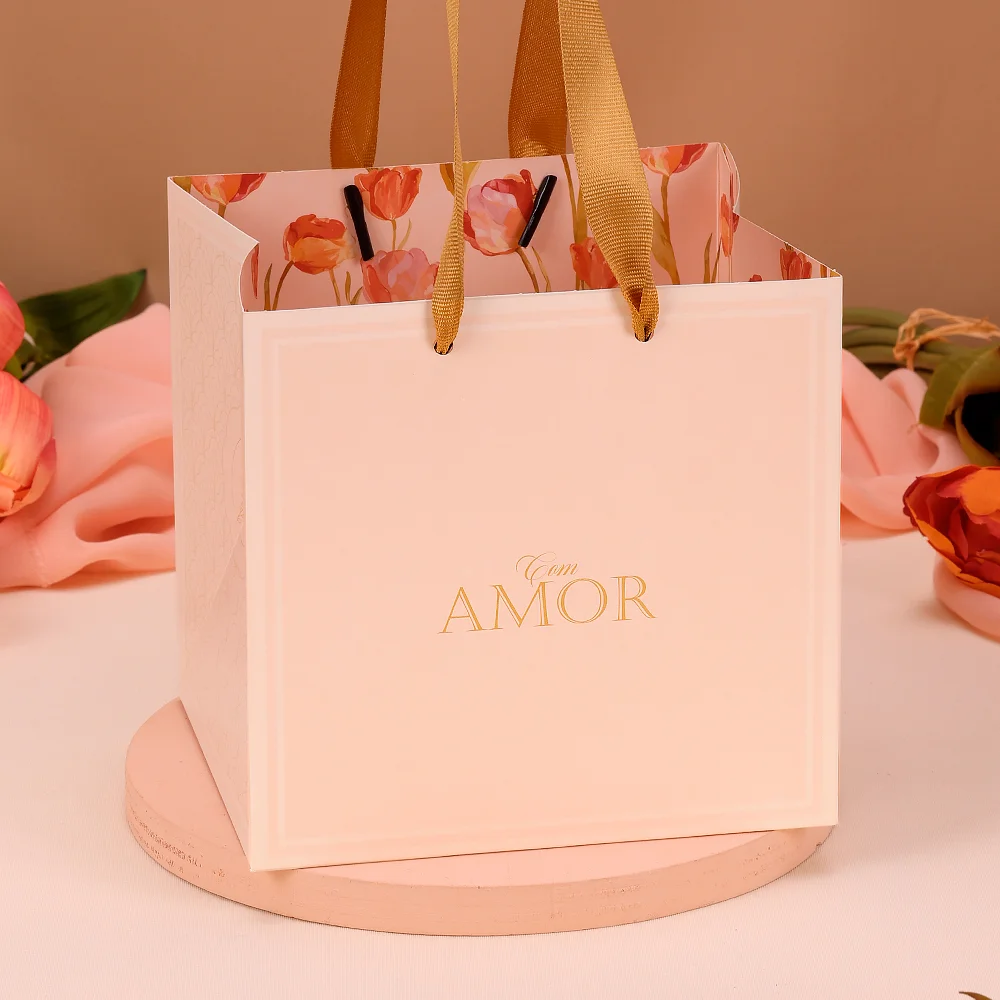 A sacola possui alças de fita e se destaca pelo acabamento decorativo, que deixa a apresentação mais elegante e chique
