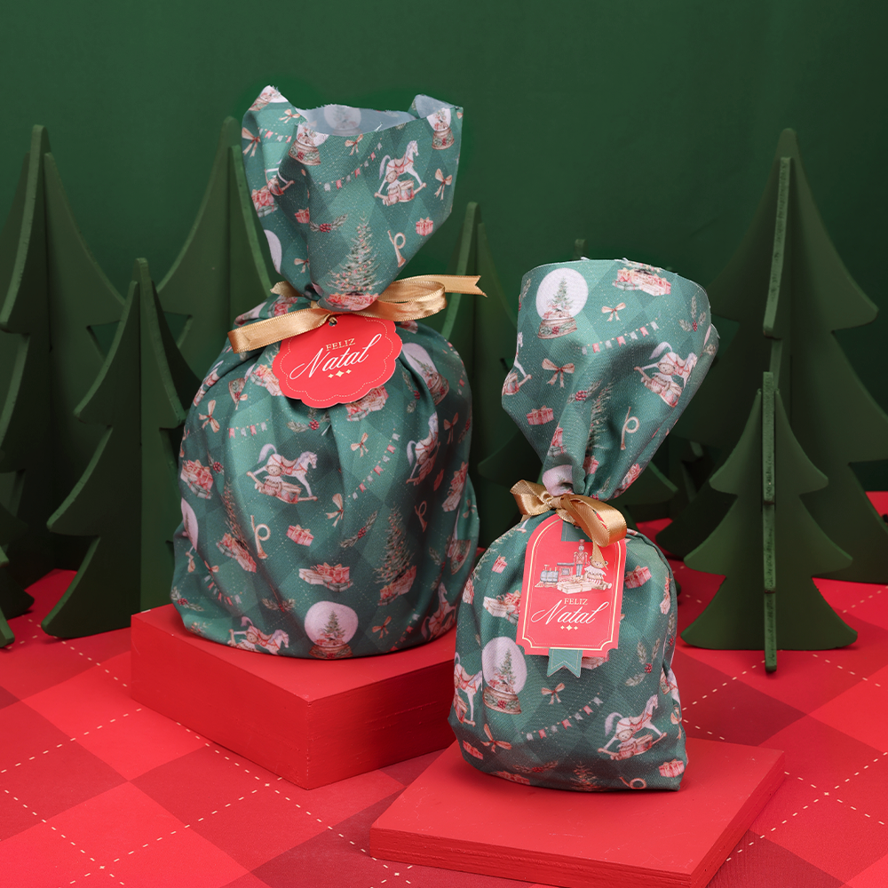 A estampa do saco tem fundo verde e apresenta elementos natalinos delicados, como cavalinhos de madeira, árvores de Natal, presentes, bolas decorativas e guirlandas. O padrão é distribuído de forma harmônica, criando um visual festivo e encantador, que remete à magia e ao clima clássico do Natal.